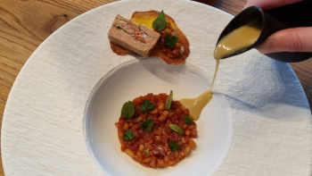 Soupe de Cuchaule AOP, pomme caramélisée, foie gras marbré à la truffe